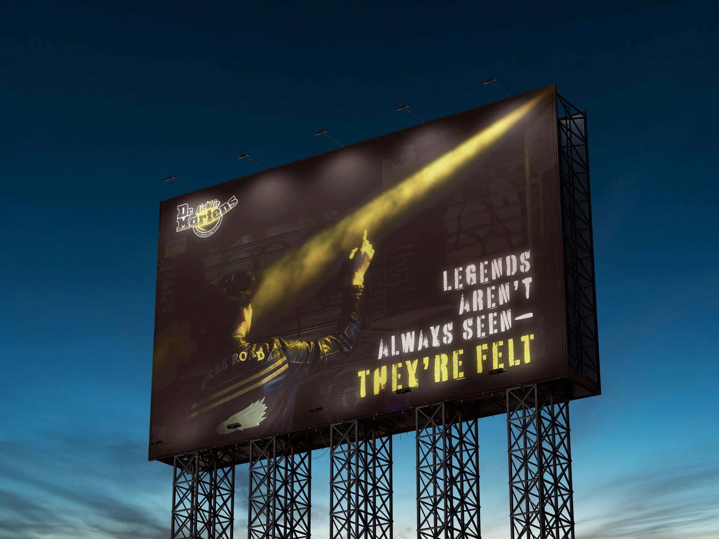 This conceptual still-image campaign for Dr. Martens conveys the brand’s rebellious spirit and cultural legacy without showing the product directly. Instead, it uses abstract lighting, negative space, and symbolic visual cues—like a yellow beam of light representing the brand’s iconic stitching—to evoke emotion and presence. Set in a gritty urban scene, the image features a silhouetted figure facing the light, symbolizing resilience and hope. The final image, created by merging three separate photos in Photoshop, invites viewers to feel the brand’s essence, emphasizing that true legends, like Dr. Martens, are felt more than seen.