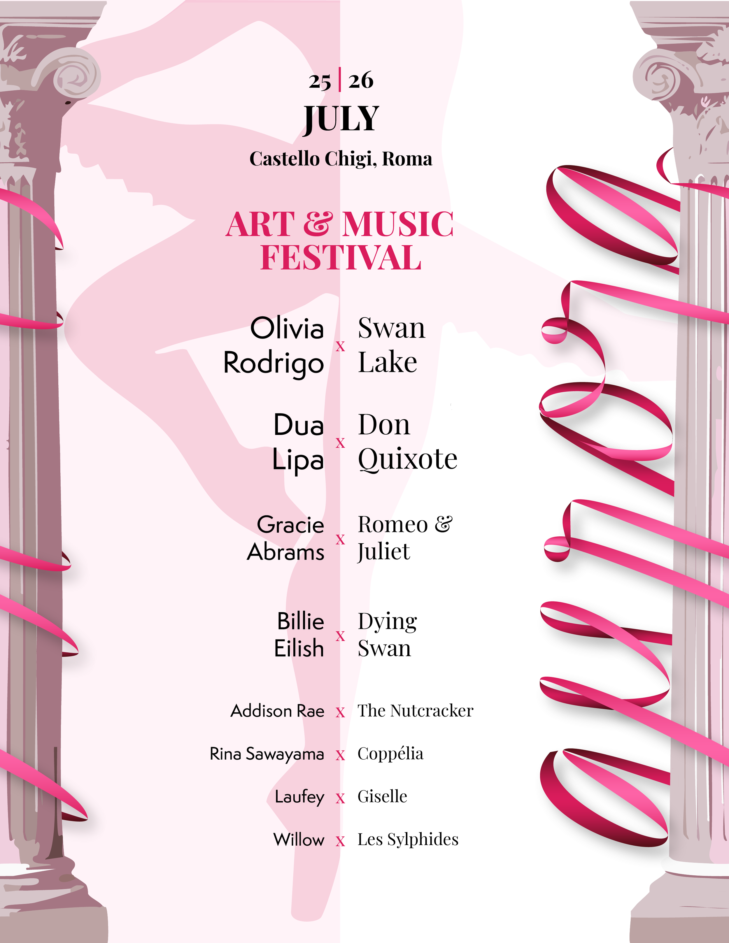 I led the ideation and creative direction for transforming Super Aurora, originally a vibrant Rome-based music festival catering to young fans of pop, rock, rap, indie, disco, and house, into Aurora, a ballet-focused cultural event. After analyzing the festival’s energetic, neon-driven identity, I reimagined it with a visual language centered on elegance, softness, and classical influence—drawing from Roman architecture, ballet aesthetics, and especially Italian étoile Eleonora Abbagnato, whose multifaceted presence as a ballerina, actress, and model strongly appeals to our new audience of classical music fans, young girls, and artistic individuals. Her debut role as Aurora in The Sleeping Beauty became the conceptual anchor for the rebrand, shaping both the festival’s name and narrative connection to ballet.